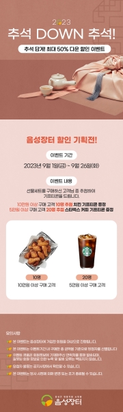 [충청뉴스큐] 음성군은 민족최대 명절인 추석을 맞아 이번 달 26일까지 음성군 명품작물 온라인 쇼핑몰 ‘음성장터’ 에서 추석맞이 기획전을 진행한다.