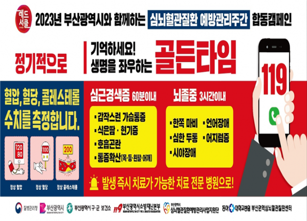 [충청뉴스큐] 부산시는 오늘 오전 11시부터 오후 1시까지 시청 1층 로비에서 ‘2023년 심뇌혈관질환 예방관리주간 레드서클 캠페인’을 개최한다고 밝혔다.