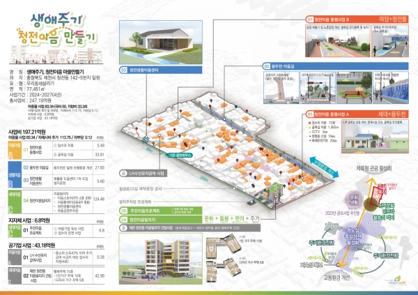 주요사업으로는 청전이음 동행사업, 용두천 이음길, 청전생활 이음센터, 청전이음 빌리지로 20년 이상 된 노후 주택을 정비하고 골목길 정비와 함께 주변 환경을 정리할 수 있게 되어 생활환경 개선이 이뤄질 것으로 기대하고 있다.