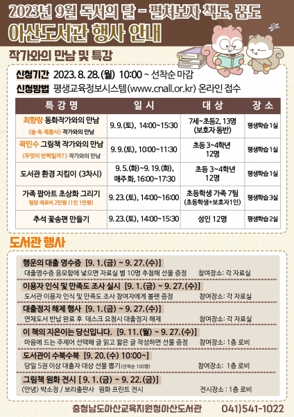 [충청뉴스큐] 충청남도아산교육지원청아산도서관은 2023년 9월 독서의 달을 맞아 ‘펼쳐보자 책도, 꿈도’라는 슬로건으로 다양한 독서행사 및 특강을 운영한다.