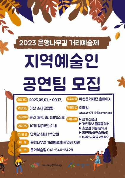 [충청뉴스큐] 아산문화재단은 오는 9월 1일부터 17일까지 ‘2023 은행나무길 거리예술제’ 지역예술인 공연팀 공모를 진행한다.