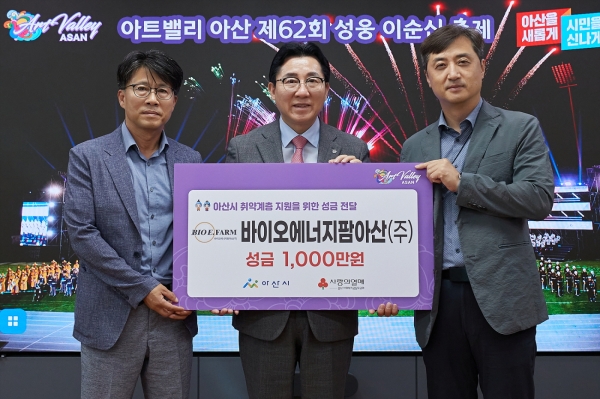이재승 바이오에너지팜아산 대표는 “추석명절을 맞이해 주변의 어려움을 겪고 있는 이웃들이 좀 더 행복하길 바라는 마음에 후원금을 기탁하게 됐다”며 “작은 정성이지만 풍성한 한가위가 되시길 바라며 앞으로도 꾸준한 활동을 통해 지역사회에 선한 영향력과 봉사정신을 전하는 기업이 될 수 있도록 노력하겠다”고 말했다.