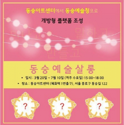 오는 20일부터 7월 24일까지 격주 수요일 오후 3시마다 동숭아트센터에서 개방형 라운드테이블 ‘동숭예술살롱_가치와 문화가 공존하는 법’을 진행한다. ‘동숭예술살롱’은 각 분야의 전문가를 섭외해 2020년 완공되는 ‘예술청’의 가치와 운영모델 제안을 위한 발제 및 토론 등을 나누는 자리로, 회당 40여 명씩 총 10회 운영된다.