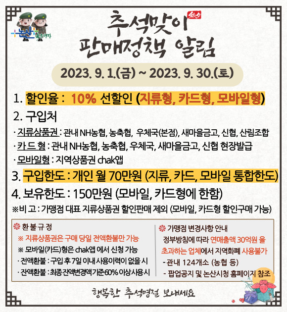 기존에는 모바일형의 경우에만 10% 할인가로 충전할 수 있었으나, 시는 추석을 맞아 많은 시민들이 지역화폐로 명절 성수품을 마련할 수 있도록 지류형·카드형으로도 할인 범위를 넓혔다.
