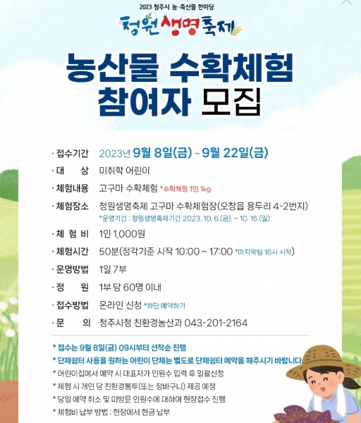 [충청뉴스큐] 청주시는 오는 10월 6일부터 10월 15일까지 청원구 오창읍 미래지농촌테마공원에서 펼쳐지는 청원생명축제에서 시민 참여행사의 일환으로 ‘농산물 수확체험장’을 운영한다고 밝혔다.