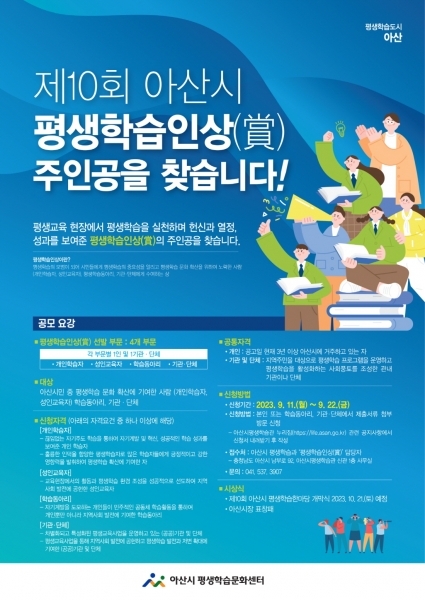 [충청뉴스큐] 아산시가 모범 평생학습인을 발굴·시상하기 위한 ‘제10회 아산시 평생학습인상’ 후보자를 모집한다.
