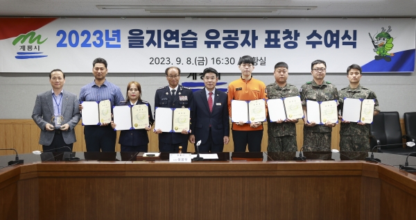 [충청뉴스큐] 계룡시는 지난 8월 21일부터 24일까지 4일간 실시한 ‘2023년 을지연습’을 성공적으로 마무리하고 비상 대비태세 확립에 기여한 유공자 15명에게 표창을 수여했다고 밝혔다.