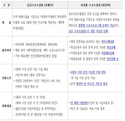 ‘서울형 스포츠클럽’은 공공스포츠클럽의 선정요건을 충족시키지는 못하나, 민·관 체육시설을 거점으로 다연령·다수준의 회원에게 생활체육 프로그램과 지도자를 제공하는 비영리법인 또는 단체를 대상으로 해, 공공 스포츠클럽으로 발전할 수 있는 징검다리 역할을 수행할 계획이다.
