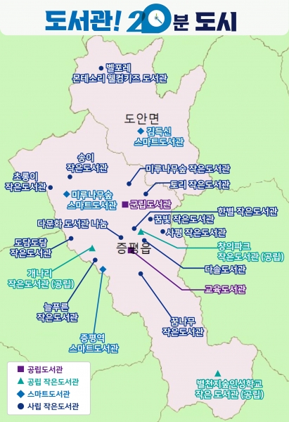 또한 도안면 행정복지센터, 보강천 미루나무숲, 증평역에는 스마트 도서관이 설치돼 걸어서 20분내에 책을 빌릴 수 있는 시스템을 갖추고 있다.