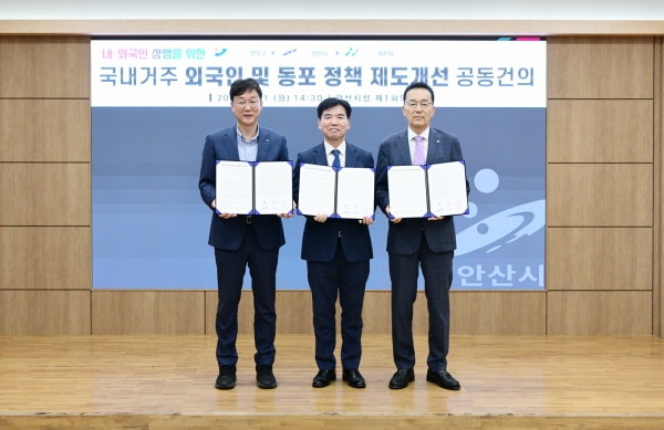 시는 지난 11일 안산시청에서 인천 연수구, 안산시와 ‘국내 거주 외국인 및 동포 정책 제도 개선’을 위한 공동건의문에 서명했다.