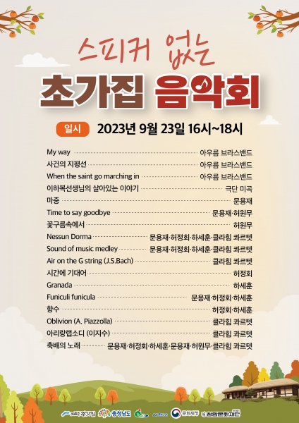 이번 행사는 고즈넉한 초가집 앞마당에서 성악과 현악, 브라스 관악기가 함께 어우러진 음악회로 가을의 정취를 한껏 전해줄 것으로 기대된다.