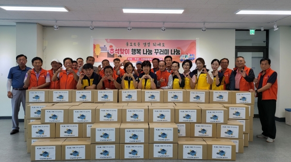 [충청뉴스큐] 서천군 서천읍행복나눔후원회가 지난 12일 추석을 맞아 주변 소외된 이웃 100가구에 식료품 꾸러미를 전달해 이웃 간의 따뜻한 정을 나눴다.
