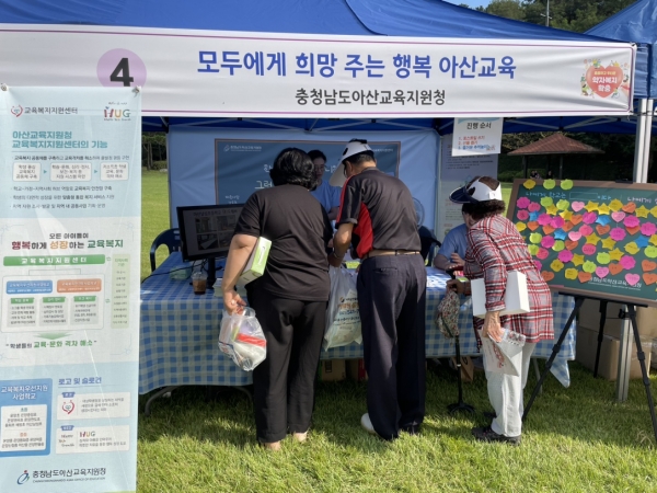 이날 체험부스에서는 ‘모두에게 희망 주는 행복 아산교육’의 슬로건으로 교육복지 주요 사업을 안내하고 교육의 의미에 대해 생각해 볼 수 있는 이벤트를 진행했다.