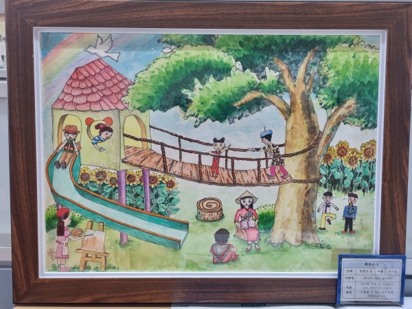 최우수상을 수상한 박서림 아동은 “다문화, 장애 등 상관없이 모든 아이들이 차별받지 않고 다같이 즐겁게 뛰어 놀 수 있는 모두가 하나가 되는 놀이터를 상상하며 그림을 그렸다”고 수상소감을 밝혔다.