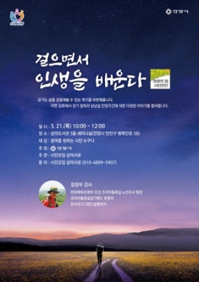 [충청뉴스큐] 안양시가 주최하고 시민동아리 ‘삼덕서로’가 주관하는 시민주도형 강좌 ‘걸으면서 인생을 배운다’가 오는 21일 오전 10시 삼덕도서관 3층 세미나실에서 개설된다.