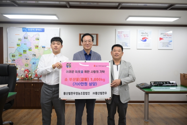 황산벌한우영농조합법인과 ㈜황산벌한우는 논산표 우량 한우를 사육·가공·유통하는 전문업체로 평소 지역사회 소외계층을 위한 나눔 활동을 지속적으로 펼쳐오고 있어 많은 이들에게 귀감이 되고 있다.