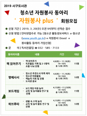 [충청뉴스큐] 인천서구도서관은 청소년들이 꿈과 재능을 펼치며 올바른 인성 함양 및 가치관 형성을 위해 2019 서구도서관 청소년 자원봉사 동아리‘청소년 자원봉사 플러스’를 운영한다.