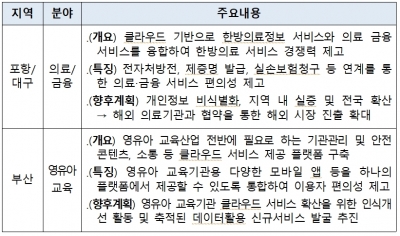 과기정통부는 정보통신산업진흥원을 통해 광역지자체 컨소시엄 중 한 곳을 선정해 오는 2020년 11월까지 최대 9억 6천만원의 정부출연금을 지원할 계획이며, 선정된 지자체는 지자체 내 축적된 금융·물류·관광 등 데이터와 인공지능, 블록체인 등이 융합된 클라우드 플랫폼 및 응용 소프트웨어 서비스 개발을 수행하고, 지역 내 서비스 실증을 통해 규제 샌드박스 연계 및 관련 법·제도를 개선해, 향후 전국적으로 서비스를 확산하고자 한다.