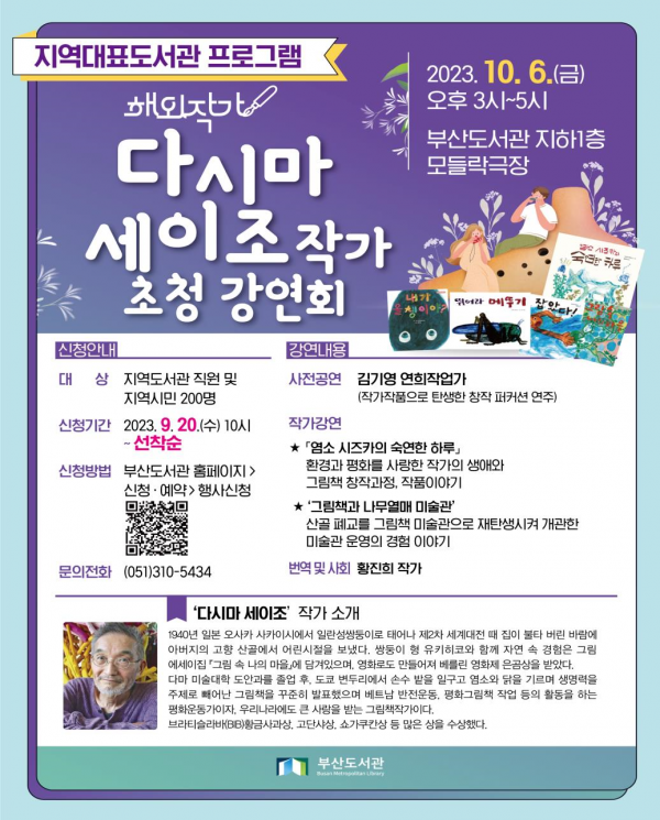 [충청뉴스큐] 부산도서관은 오는 10월 6일 오후 3시 부산도서관 모들락극장에서 해외작가 ‘다시마 세이조’ 초청강연회를 개최한다고 밝혔다.