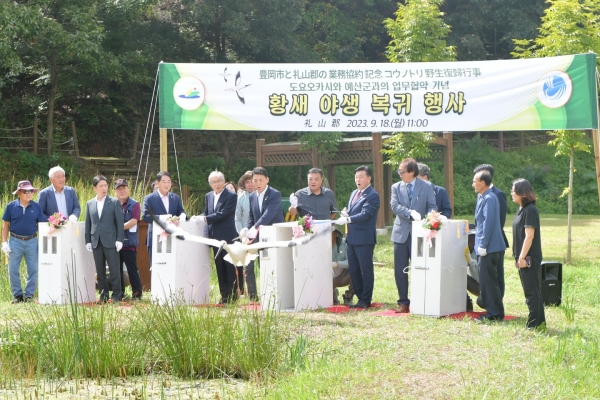 [충청뉴스큐] 예산군은 지난 18일 일본국 효교현 도요오카시와 황새의 유전적 다양성을 위한 업무협약을 추진하고 황새 4개체를 자연으로 돌려보내는 황새 야생 복귀행사를 개최했다.