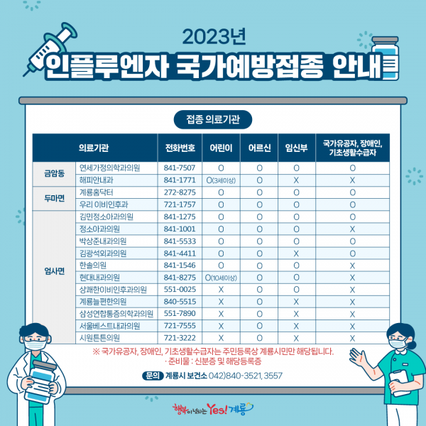 [충청뉴스큐] 계룡시 보건소는 20일부터 내년 4월 30일까지 보건소와 관내 민간의료기관 16개소에서 인플루엔자 국가예방접종을 실시한다고 밝혔다.