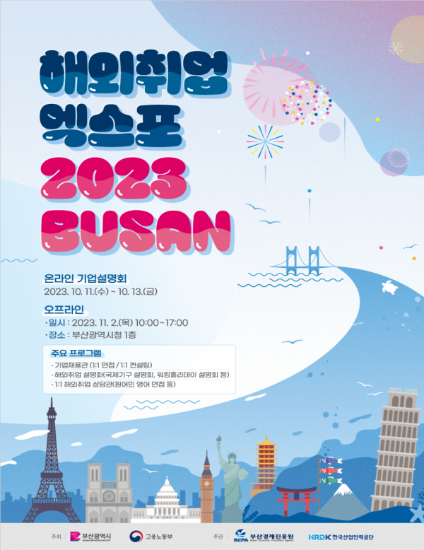 ‘해외취업 엑스포 2023 부산’은 오는 11월 2일 오전 10시 시청 1층에서 개최되며 해외 우수기업과의 만남의 장을 제공해 지역 청년들의 해외 취업을 돕기 위해 마련됐다.