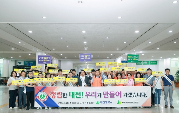 이장우 시장은 “이번 청렴 캠페인을 통해 직원들이 청렴에 대한 중요성을 다시 한번 되새기기 바란다” 라며 “부패행위 근절과 함께 청렴한 공직문화가 조성될 수 있도록 노력하겠다”고 말했다 한편 대전시는 9.18~21까지 4일간 청렴주간을 운영하며 실국별 청렴릴레이, 청렴다트게임 등 참여형 프로그램으로 청렴 붐을 조성하고 있다.