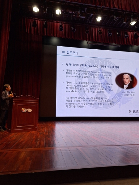 그는 이어 “자유주의는 개인의 존엄성과 개인 삶의 중요성에 대한 인식에서 출발하고 민주주의는 공동의 삶을 어떻게 관리하는가의 문제 인식에서 출발한다. 이 둘의 문제는 상호 긴밀히 연결되어 있지만 불가피한 긴장성을 내포하고 있다”고 설명했다.