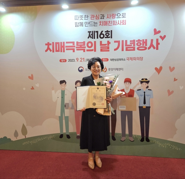 치매파트너 활동으로‘치매 환자 실종 예방 모의훈련’에 참여해 실종 치매 환자 역할을 맡아 연기했으며 프로그램 보조, 인식개선 홍보 등 치매 환자와 가족을 위해 다방면의 치매 관리 사업에서 적극 봉사하였기에 공로를 인정받았다.