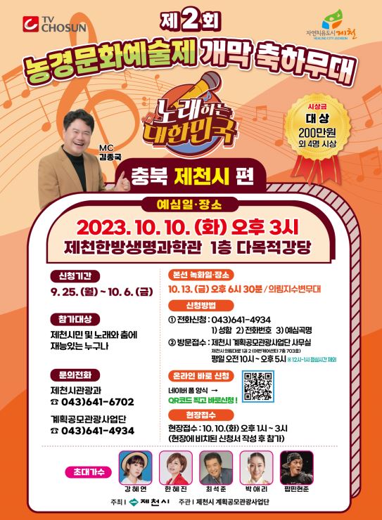 [충청뉴스큐] 제천시가 오는 10월13일 ~ 15일에 열리는 ‘제2회 의림지 농경문화 예술제’의 개막 축하 행사로 시민들의 숨겨진 재능을 뽐낼 수 있는 TV조선 노래자랑 프로그램 ‘노래하는 대한민국’을 마련하고 예심 참가자를 모집한다.