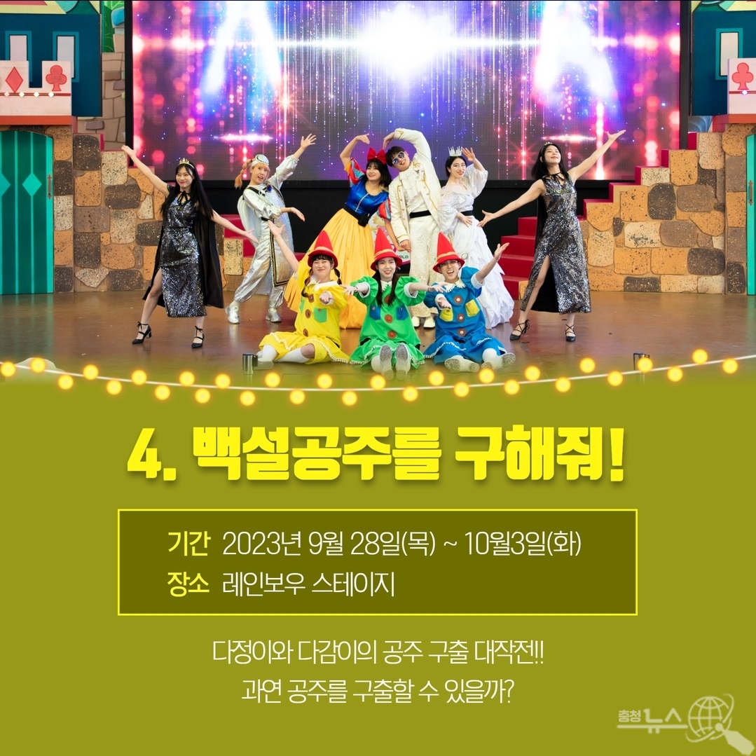 이번 추석 황금연휴에는 ‘줄타기 공연’과 ‘한국춤·국악소녀 공연’을 특별히 마련했다. ‘줄타기 공연’은 오월드 정문광장에서 볼 수 있으며, 레인보우 스테이지에서는 ‘한국춤·국악소녀 공연’을 비롯하여 ‘추억의 복고댄스’와 ‘가족 뮤지컬 백설공주’를 관람할 수 있다.