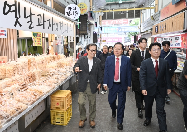 [충청뉴스큐] 민족 최대의 명절인 추석을 맞이해 홍준표 대구광역시장은 9월 25일 오후 대구 3대 전통시장 중 하나인 관문상가시장을 방문해 서민경제의 최일선에서 열심히 일하는 상인들을 격려하고 생활용품을 온누리상품권으로 직접 구매하는 등 전통시장 장보기 행사를 실시했다.