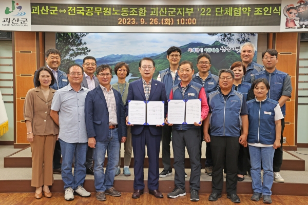 [충청뉴스큐] 충북 괴산군은 26일 전국공무원노동조합 충북지역본부 괴산군지부와 단체협약 체결을 위한 조인식을 가졌다.