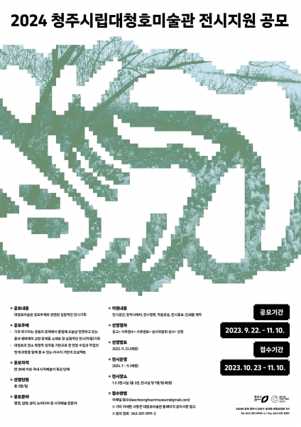 [충청뉴스큐] 청주시립미술관 분관 대청호미술관은 국내 시각예술 작가들의 실험적인 전시기획을 지원하는 ‘2024년 대청호미술관 전시지원 공모’를 진행한다고 27일 밝혔다.