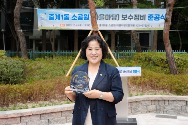 [충청뉴스큐] 서울특별시의회 환경수자원위원회 봉양순 위원장이 10월 4일 중계1동 소공원에서 열린 노후 마을마당 보수정비 준공 행사에서 노원구청으로부터 ‘감사패’를 수여 받았다.