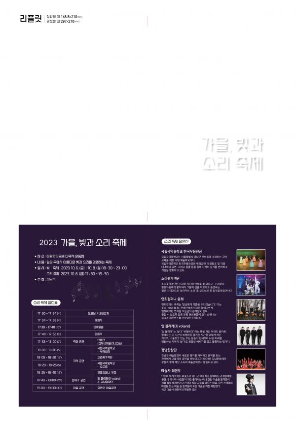 특히 6일 오후 5시 30분부터 펼쳐지는 소리축제에서는 안정현 전자바이올리니스트의 축하공연을 시작으로 전통 국악과 퓨전 국악 공연, 강남합창단과 일볼라레 팝페라의 협연과 최현우 마술사의 빛을 활용한 마술 등이 펼쳐질 예정이다.