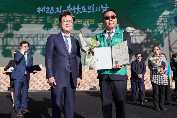 [충청뉴스큐] 최동석 아산시새마을회 회장이 지난 5일 부여군 백제문화단지에서 열린 제28회 충남도민의 날 기념식에서 모범도민상을 받았다.