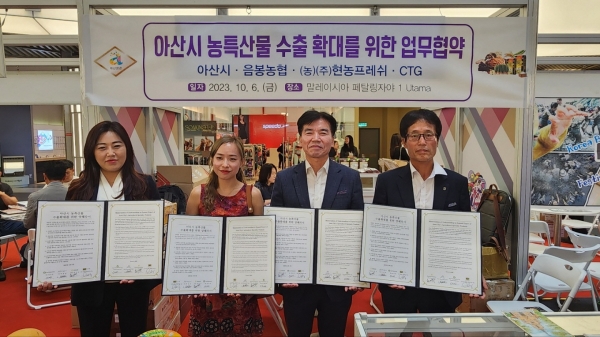 [충청뉴스큐] 아산시는 6일 자매도시인 말레이시아 현지 최대 신선 과실류 수입업체인 CTG와 농특산물 수출 확대를 위한 업무협약을 체결했다.