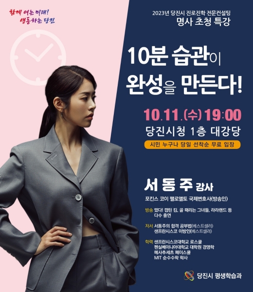 이번 특강을 진행할 명사는 아이비리그와 미국 5대 법무법인 출신의 국제변호사 겸 방송인 서동주 씨로 ‘10분 습관이 완성을 만든다’는 주제로 강연한다.