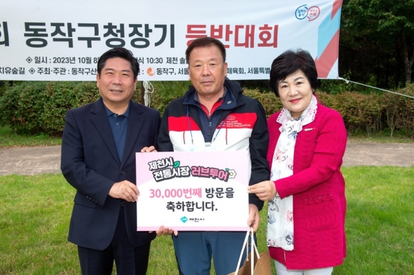 이에 시는 지난 8일 김창규 시장과 이정임 의장 등이 참석한 가운데 한방생태숲 잔디광장에서 전통시장 러브투어 3만 번째 방문객으로 동작구 산악연맹 회원 중 주영곤 회장을 선정해 환영식을 열고 소정의 지역특산품을 증정했다.