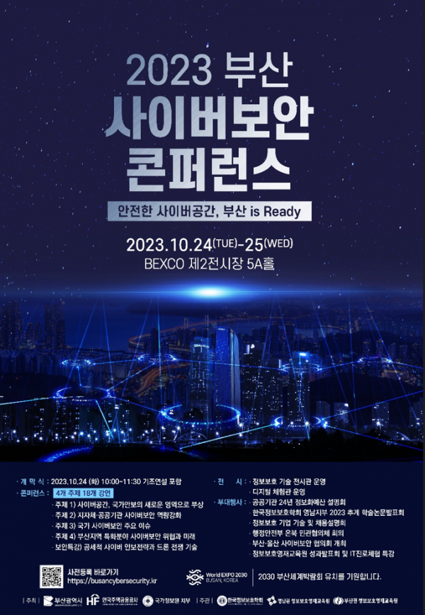 [충청뉴스큐] 부산시는 오는 10월 24일과 25일 이틀간 벡스코 제2전시장에서‘2023 부산 사이버보안 콘퍼런스’가 개최된다고 밝혔다.