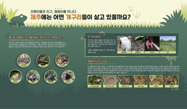 이번 전시에는 제주에 서식하는 양서류 7종에 대한 생물표본을 비롯해 맹꽁이 번식 과정과 양서류의 천적, 개구리와 제주어, 청개구리와 함께 하는 포토존, 개구리 스토리텔링 등이 소개된다.