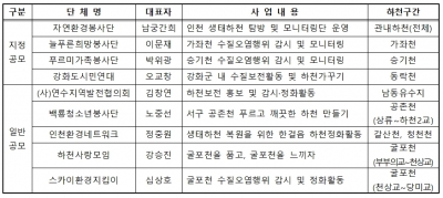 ‘민간단체 수질보전활동사업’은 시와 민간단체의 협약을 통해 지정된 하천구간의 쓰레기 및 오물제거 정화활동, 꽃길 가꾸기 식재활동, 수질오염행위 감시 등을 통해 하천 수질보전활동을 하는 사업이다.