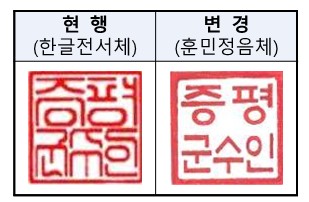 [충청뉴스큐] 올해 개청 20주년을 맞은 충북 증평군이 공식도장의 글씨체를 한글전서체에서 훈민정음체로 변경해 11일부터 사용한다.