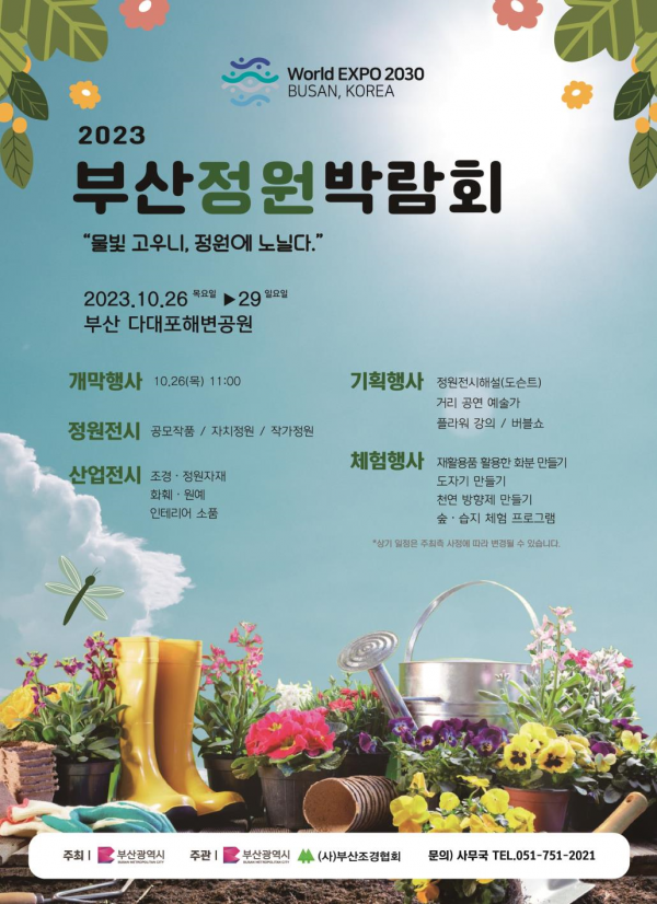 [충청뉴스큐] 부산시는 오는 26일부터 29일까지 다대포해변공원 중앙광장 일원에서 ‘물빛 고우니, 정원에 노닐다’를 주제로 ‘2023년 부산정원박람회’를 개최한다고 밝혔다.