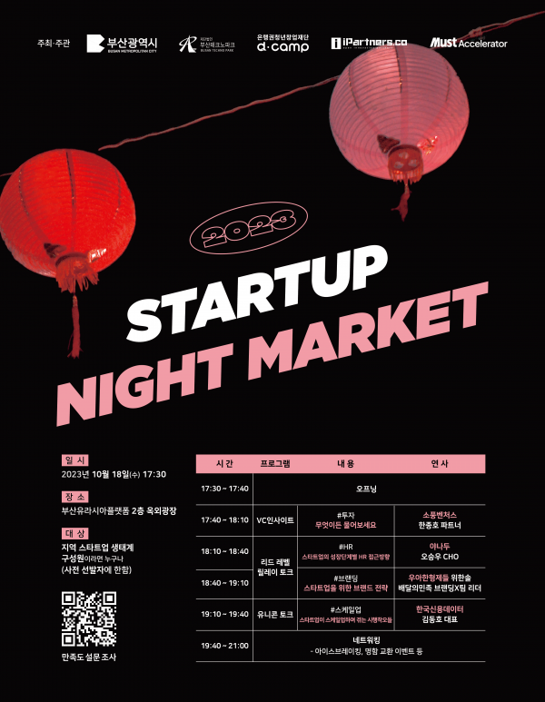 이번 행사는 야시장을 콘셉트로 하며 ‘창업생태계 고수들의 비법 전수’를 주제로 한 3개의 프로그램과 다양한 창업생태계 구성원들과 소통할 수 있는 네트워킹의 장으로 구성될 예정이다.