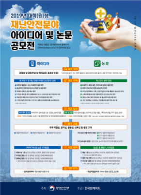 공모 주제는 아이디어 부문은 미세먼지·폭염·한파·지진·대형 화재 등 최근 이슈가 되고 있는 재난에 대한 효과적인 대응 방안 등이며, 논문 부문은 자연·사회·미래·특수재난 및 4차 산업혁명 기술을 활용한 안전 관리 등 재난안전 분야 전반에 대해 자유롭게 연구해 제출하면 된다.