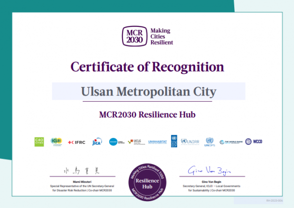 [충청뉴스큐] 울산시가 유엔 재난위험경감사무국에 '재난복원력 중심도시' 인증을 받았다.