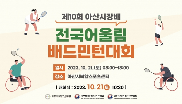 아산시장애인체육회·대한장애인배드민턴협회가 주최하고 아산시장애인체육회·아산시장애인배드민턴협회가 주관하는 이번 대회는 배드민턴을 사랑하는 장애인·비장애인 선수 및 관계자 300여명이 모여 뜨거운 승부를 펼칠 예정이다.