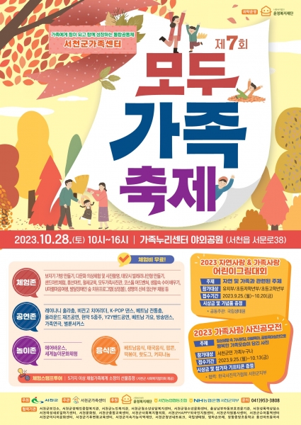 서천군가족누리센터가 주관으로 열리는 이날 행사에는 서천군 가족들 대상으로 가족문화체험존·공연존·놀이존 운영 제2회 자연사랑&가족사랑 어린이 그림그리기대회 가족사랑 사진 전시회가 진행된다.